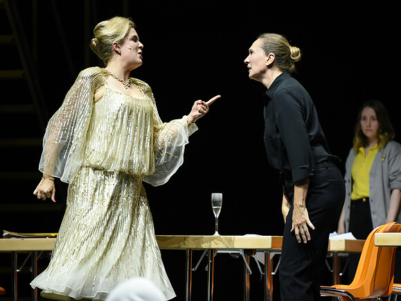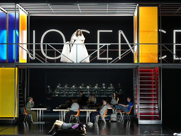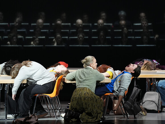 Stöppler’s staging unfolds on a two-storey set, by Ines Nadler. Initially we saw the wedding party take place on the upper level, while the school students circulated on the lower level. As the evening progressed, the characters started to change place, their memories and fates taking them physically to the different places that their psyches took them to. More than in Stone’s staging, it felt that Stöppler questioned even more explicitly what ‘innocence’ truly means. I felt a sense throughout the evening that nobody on that stage was truly innocent – whether the father-in-law who taught his son how to shoot, or the fellow student, Iris, who had also planned the school shooting along with the perpetrator. This reconfirmed in my mind the sheer strength and vividness of Oksonen and Barrière’s libretto, in how they take us on that journey deep into the minds of the victims and the nature of the guilt that they live with.