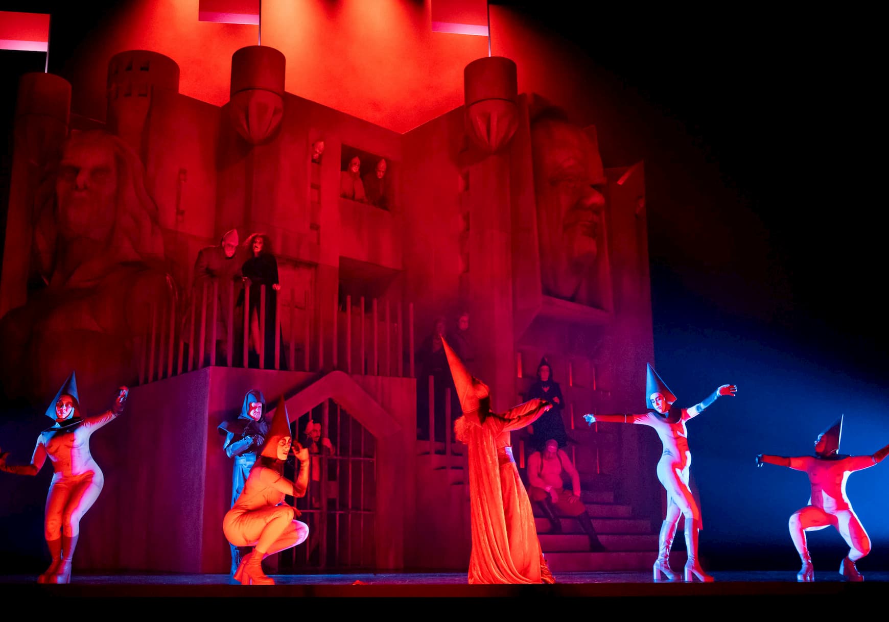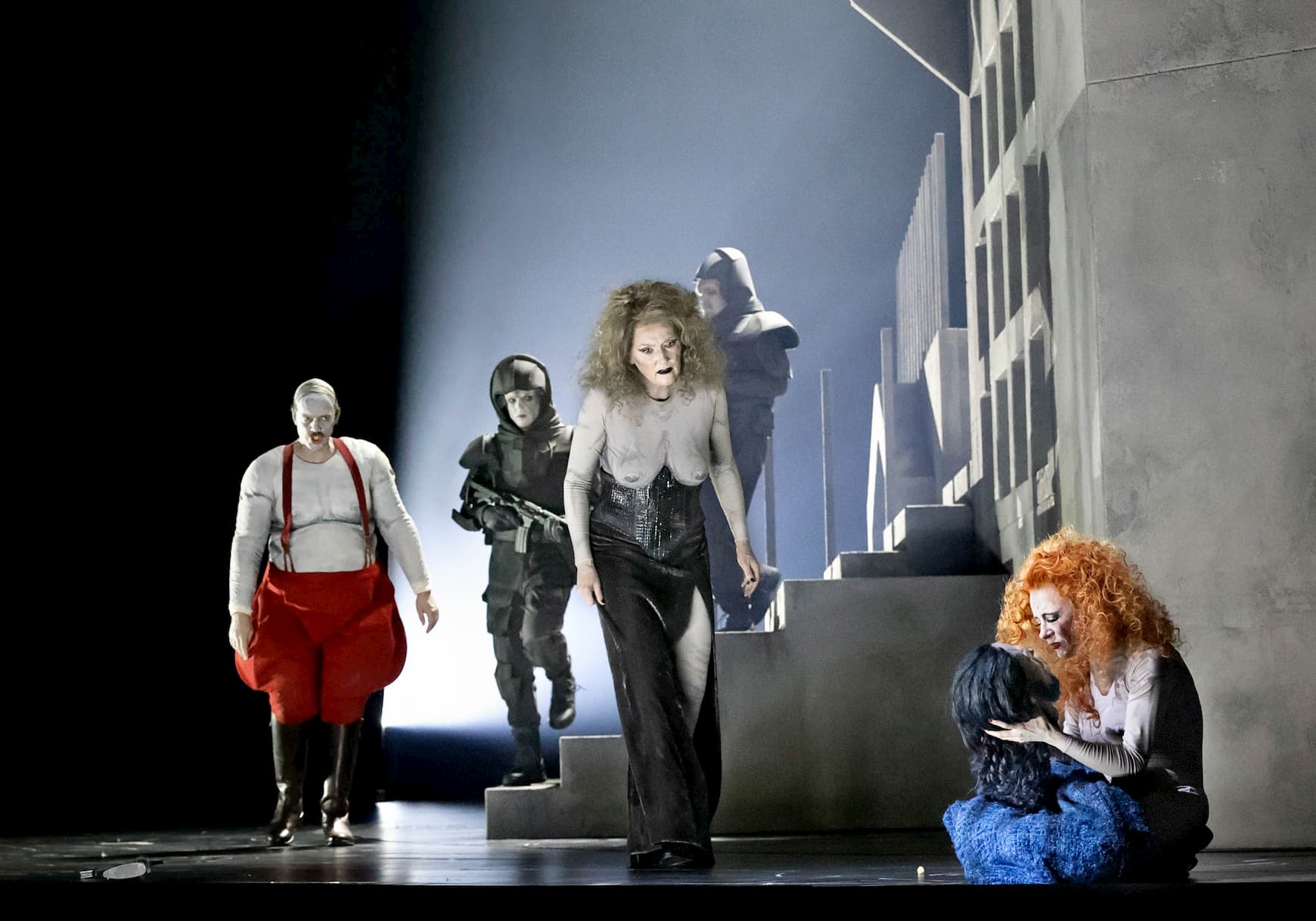 Salome is an opera that focuses on obsession and on people who are so infatuated or fanatical, they’re unable to hear what others are saying to them. Whether Salome and her single-minded obsession for a head, Jochanaan in his religious fervour immune to Salome’s overtures, or Herodes in his single-minded pursuit of a dance. In his latest staging for Opera Ballet Vlaanderen, Ersan Mondtag sets the action in what looks like a horror comic book with a fascist aesthetic. The sets and costumes, also by Mondtag, are imposing in their greyness, with a revolving stage providing both the outside of an impressive castle, as well as a dining room where a group of men engage with a group of danseuses.