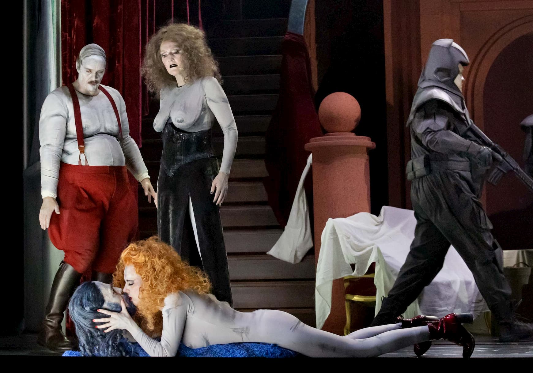 That said, Mondtag does give us some pertinent aspects to consider. One of those is the creepy manifestation of Herodes, complete with moustache and combover. Seeing the Jews running away with their suitcases packed was a reminder of the horrors that happened between Strauss’ opera being premiered and the present day. He also gives us a feminist reading, with Salome and the danseuses taking over the palace in the final scene, taking revenge on Herodes for his abuse of Salome. Both of these aspects are very convincing and make for an interesting take on the drama. Again, watching it on a surface level would offer a number of rewards, particularly as Mondtag’s personenregie is vivid and compelling. It’s just that I remain unconvinced that it stands up to deeper reflection.