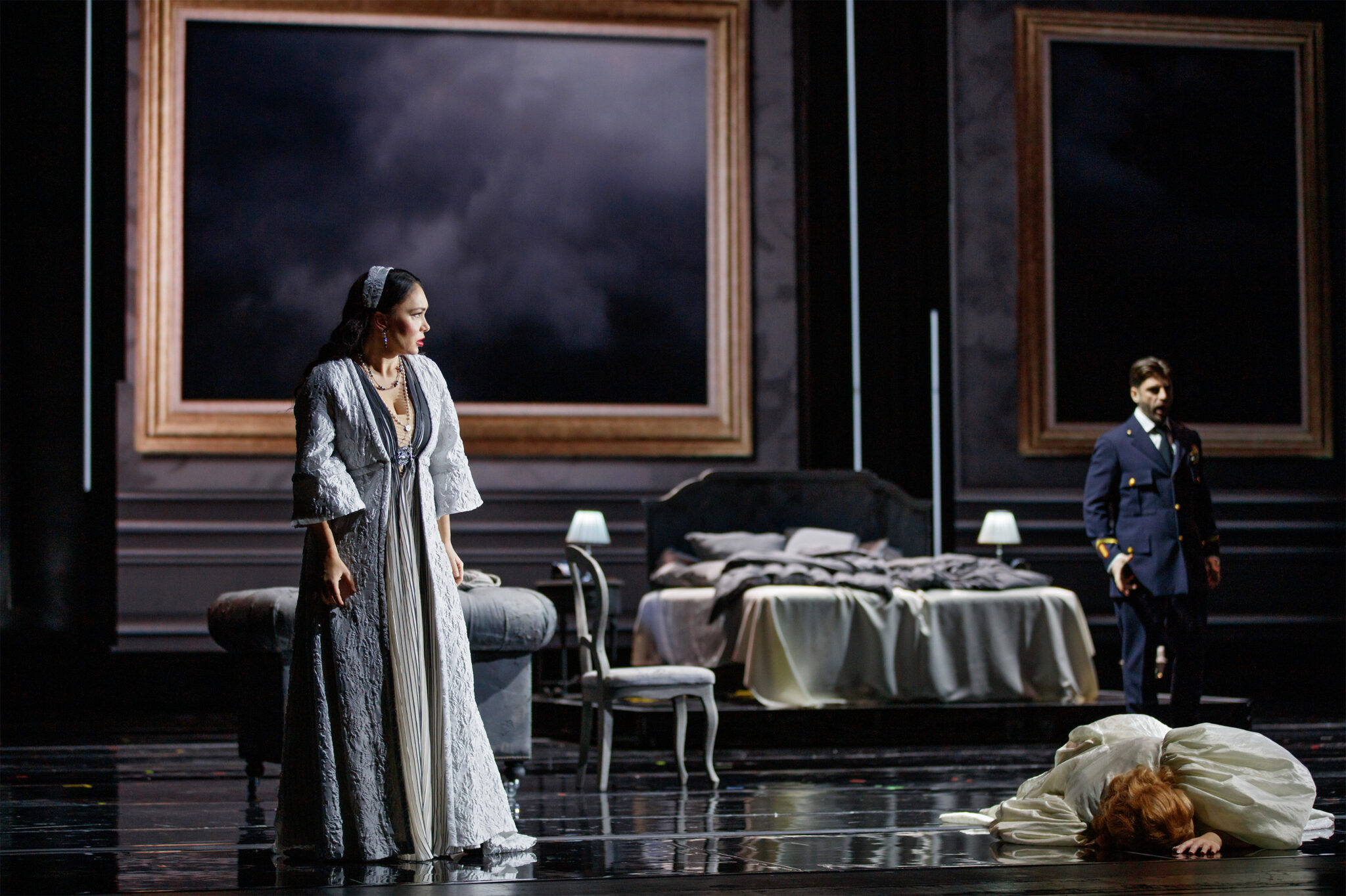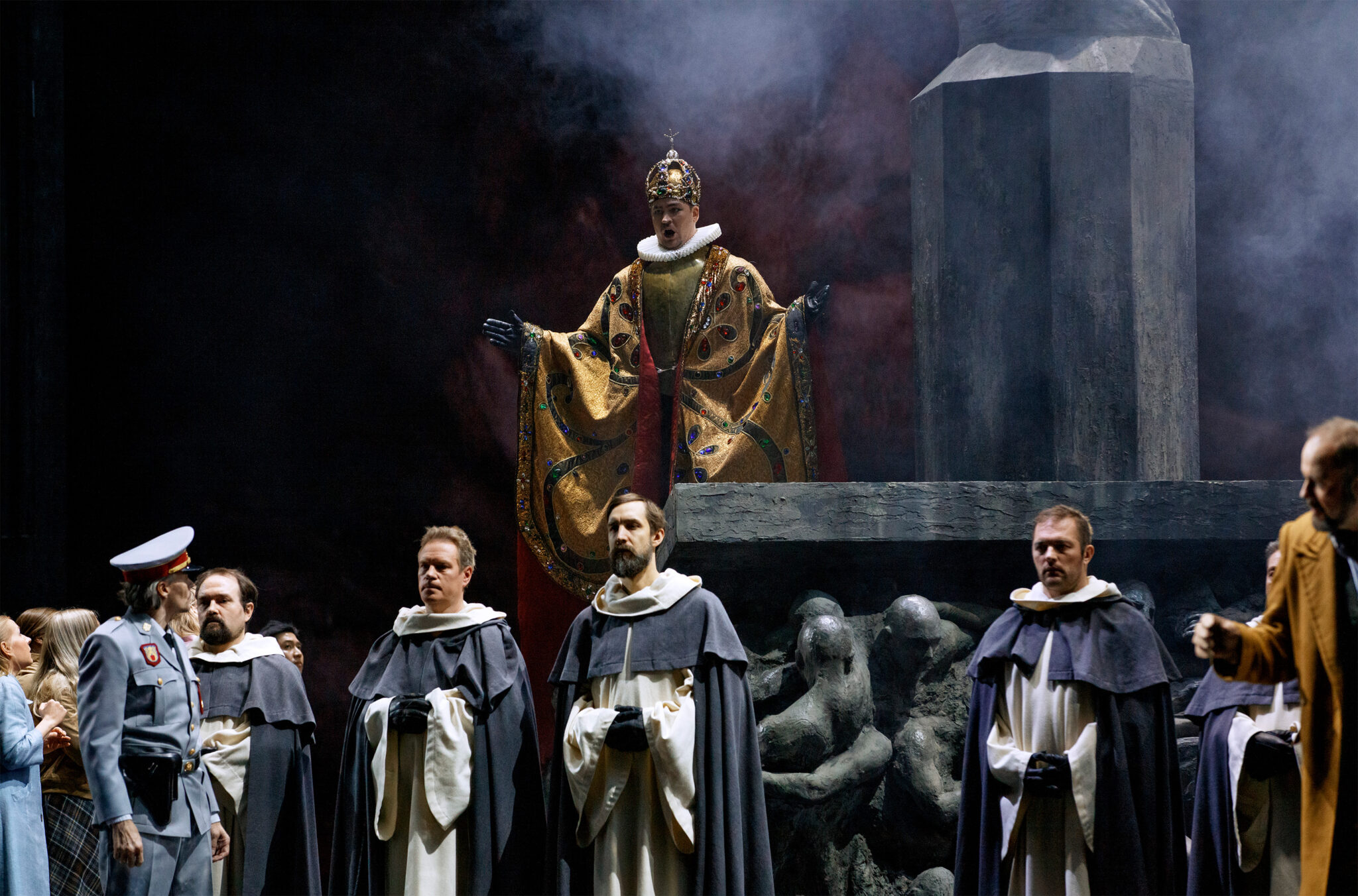 The promotional material for this new production of Don Carlo at the Finnish National Opera, might lead one to expect that we would be getting the five-act French version, given that the title and characters’ names are listed in the langue de Molière on the house’s website. In fact, what we got was the four-act Italian version, given with a single intermission. The staging, confided to Davide Livermore, is a coproduction with the Kongelige Teater in Copenhagen, where it was previously seen in the Danish capital. Tonight marked its Finnish premiere, with an international cast assembled under the direction of the house Music Director, Hannu Lintu. For consistency with the other reviews of Don Carlo(s) on this site, any reference to acts during this review will be in line with the five-act version.