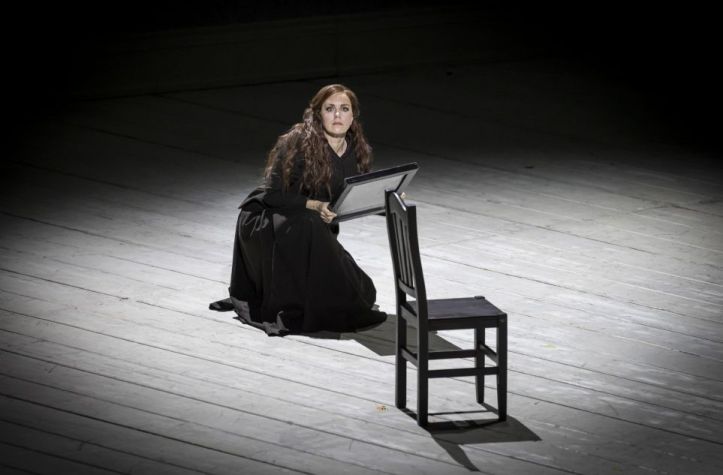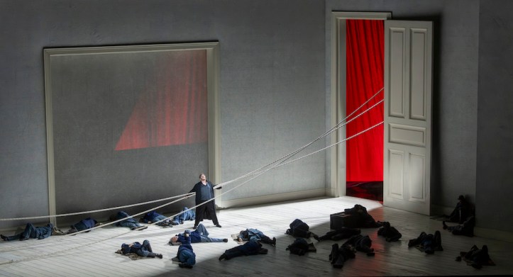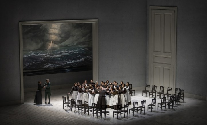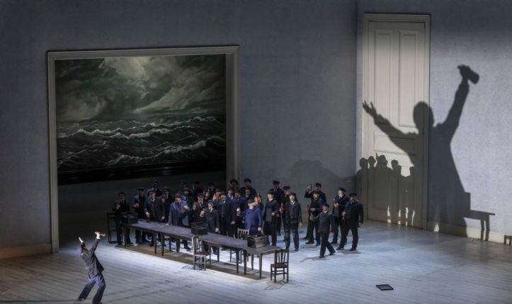 Decker’s staging, tonight revived by Stefan Heinrichs, posits an interesting question. To what extent do these fantastical legends, such as that of the Holländer, represent the delusions of a psychotic mind? Yet he doesn’t start out with that question; instead, he threads it through the evening until the final scene forces us to ask it and confront the reality of those tales that have been told over generations. Decker places the action in a large room, with a large painting showing the sea in the centre, and an oversize door on the side, through which waves are visible when it opens. In so doing, he creates a claustrophobic atmosphere that seems to take us deep into Senta’s psyche. The way in which the large painting appears, almost surreptitiously, to morph into a painting of the Holländer’s ship in a way that only Senta could see, was incredibly disturbing, as indeed was the sight of the red sails that appeared through the painting at the Holländer’s first entrance. Similarly, Decker uses the door opening to show us the shadow of the Holländer standing outside, as if wanting to prove his realness through something that also feels intangible. The evening constantly seems to progress through both real and imagined – as the choruses sang to the Holländer’s sailors on his ship, the men of Daland’s ship collapsed to the ground, leaving us with an uneasy sense of the two crews morphing into one. When the Holländer finally revealed his true nature, the fact that Senta mouthed his words along with him, forced us to reflect on whether this was all, in fact, a figment of her imagination. What Decker has given us is a staging full of ambiguity, one where we are taken into the mind of someone suffering from mental illness, yet in doing so are left wondering what is actually real in what we see.