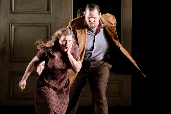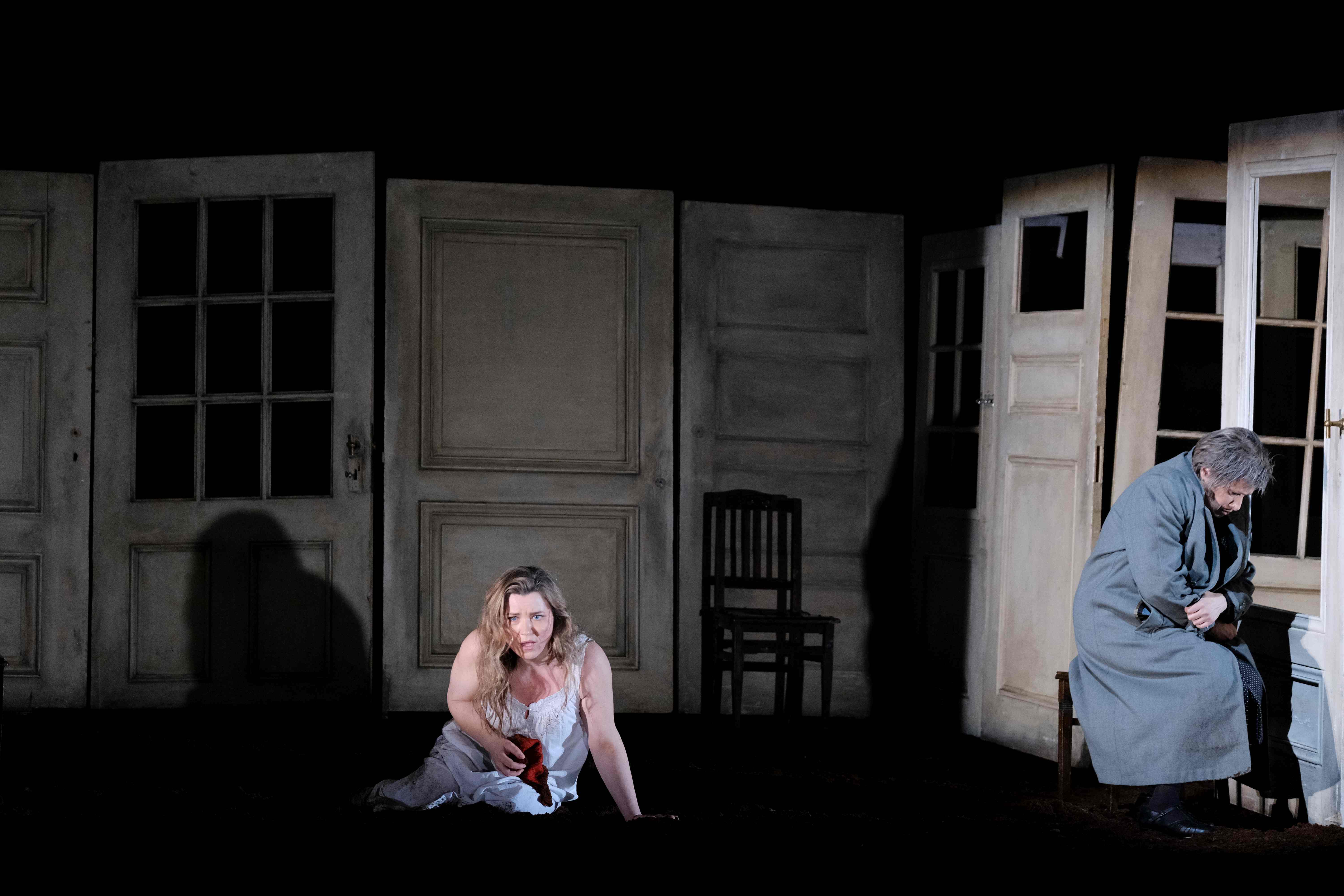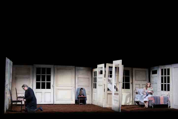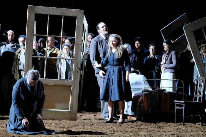 Carsen starts his staging with an interesting premise: what does it take to break free of societal oppression? In the case of Jenůfa it’s a pair of unbearable tragedies, those of infanticide and physical disfiguration. Yet how much of this societal oppression is caused by artificial rules created by humans? Carsen manifests this in a physical way through his staging. The evening begins with a set, by Patrick Kinmonth, consisting of a series of doors organized into a large enveloping square, with chorus members and actors standing outside of them looking in. As the evening progresses, the doors are moved around, manipulated to create two rooms where the Kostelnička hides Jenůfa in Act 2, or the setting for the wedding preparations in Act 3. Interestingly, Carsen and Kinmonth plant the doors in soil that covers the stage, as if to say that the rules that led to the Kostelnička killing the baby are artificial and imposed on a world by humans. Similarly, when the baby is discovered in Act 3, the chorus intimidates Jenůfa by lifting up and threatening her with the doors. It’s only in the closing dénouement, with the doors and furniture removed, that Jenůfa and Laca can find happiness, away from their oppressive society.