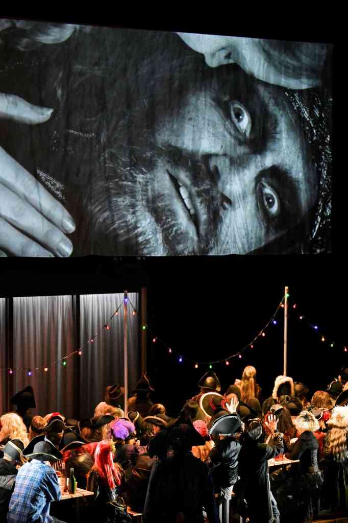 I don’t think I’d come across the work of stage director Martin G Berger previously. Upon entering the auditorium, the surtitles set the scene: An entrepreneur, Daland, hosts a pirate-themed party every seven years. Twenty-one years ago, his wife took his then fourteen-year-old daughter Senta away. This year was the first time she had returned to her originally family home. As Senta entered the home during the overture, she was handed a red skirt. Then the Steuermann, after the sailors brought beer in to the garage of the house, raised one of the floorboards to find a box below, full of photos, that he proceeded to masturbate to. Berger used video, by Vincent Stefan, to illustrate the fact that the younger Senta was forced to dress up in the red skirt to then be abused by a figure dressed up as a pirate. Berger isn’t the first to reflect on this story as the product of abuse, but he may be the first to illustrate it so blatantly. This was a world where rather than spinning wheels, Mary encouraged the ladies to spin the bottle. A world where women, and indeed men, were seen as sexual objects to be had and disposed of.
