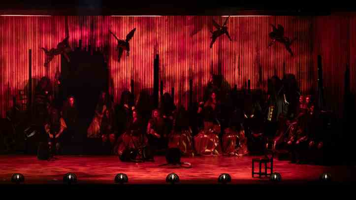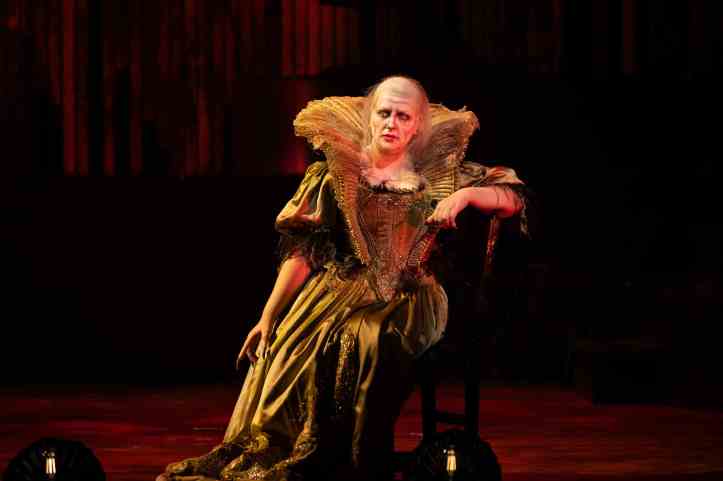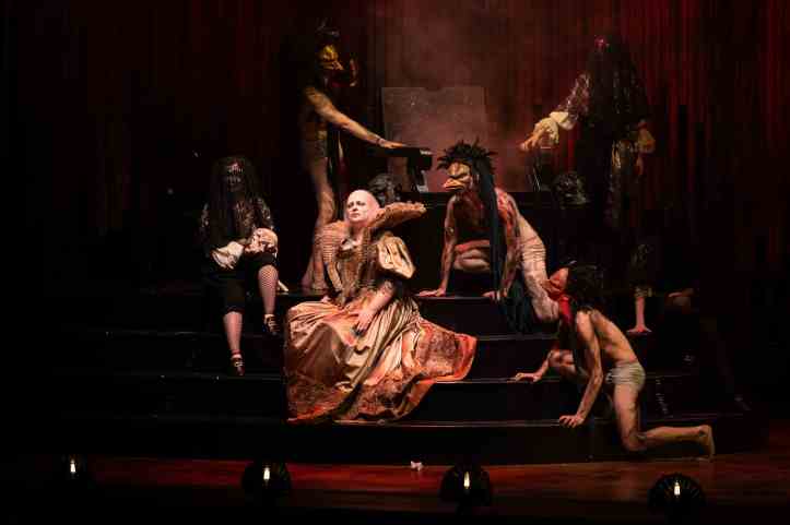 I’m very happy to report that on this occasion, that trepidation was misplaced. Unlike his other productions, Menghini instead here focuses on actually telling the story, rather than adding extraneous layers of visual ‘noise’ that drown out the work. He sets the action in a simple tiered set, by Davide Signorini, which is accessorized for each scene with various bits of stage decoration. The set is dominated by a throne to the left, through which a strange, crawling danseur exits in the Ulrica scene, and is later covered in skulls in the closing scene. It struck me that Menghini might be making a statement about colonialism here – the fact that America was built on the skulls of its aboriginal people.