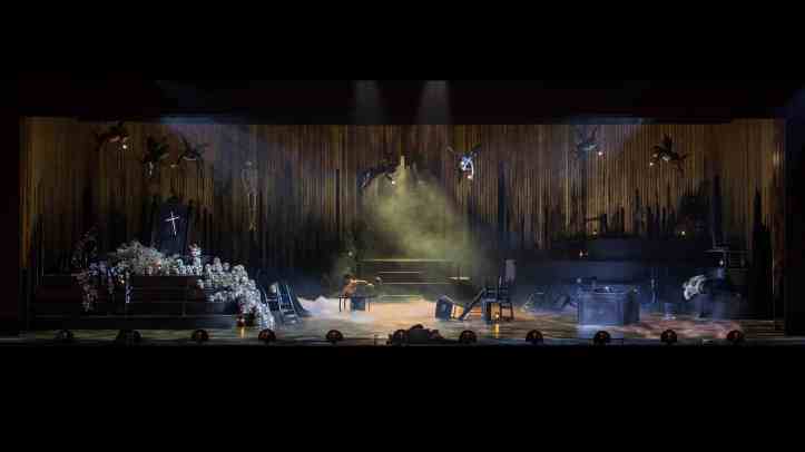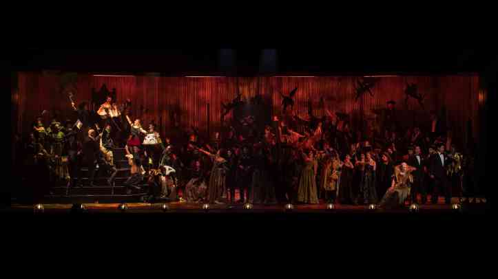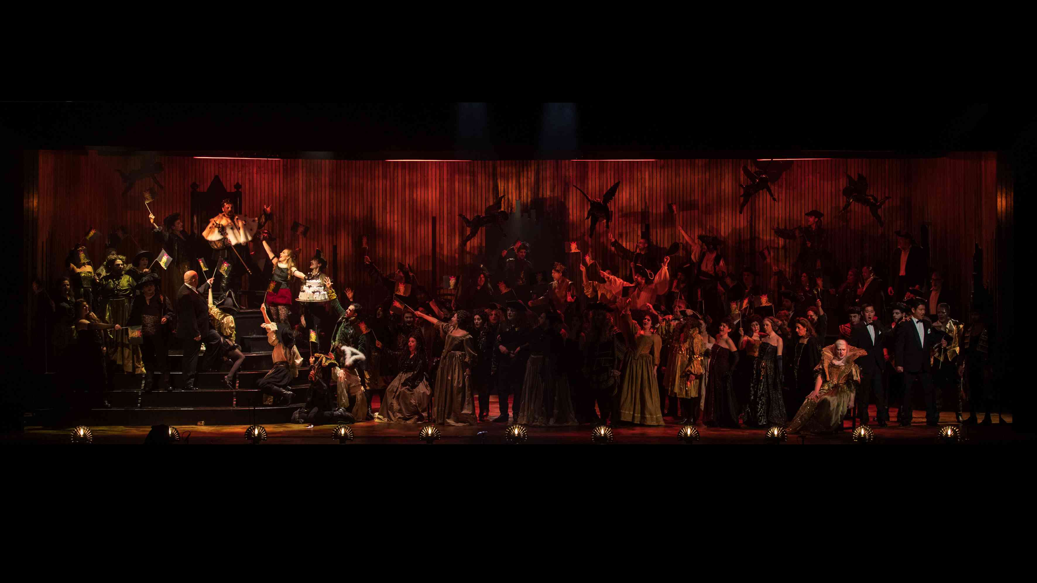 Similarly, throughout the evening, Menghini makes use of some striking stage pictures. The skeleton at the back of the stage during the Renato/Amelia confrontation, suggesting a brutality that was all-encompassing in this conspiratorial society. Having Riccardo sing his big ‘Ma se m’è forza perderti’ in front of the curtain, meant that it could open to show a vibrant ball scene with a full stage. So vibrant in fact, that the lady in front of me couldn’t help but take a photo. The sight of Amelia in the horrid field, surrounded by skulls, was also particularly striking. I do have reservations about some of Menghini’s personenregie. Amartuvshin Enkhbat as Renato is a bit of a statuesque actor, and he appeared to have been left to his own devices. On the whole, however, this is the most successful staging I’ve seen by Menghini, simply because he concentrates on the clarity of his storytelling and proved himself willing to trust the work.
