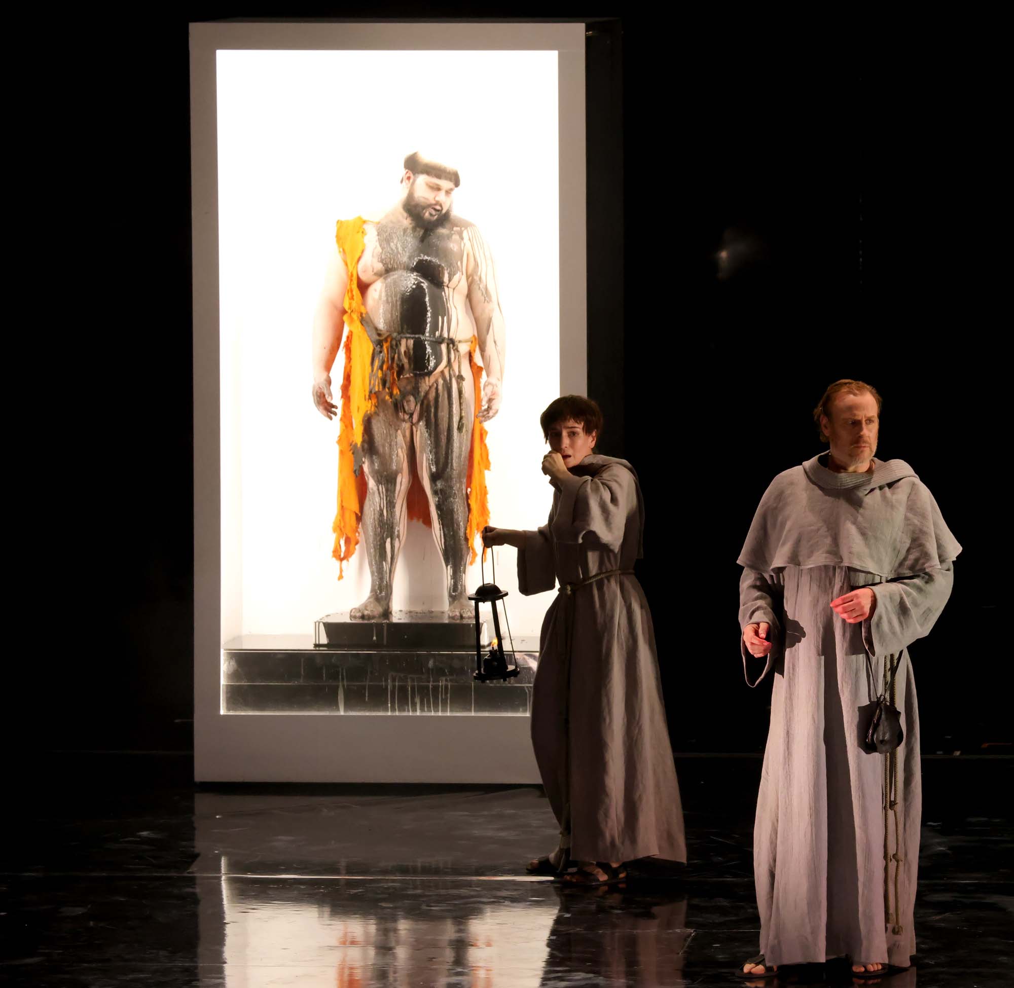 In a work set in a monastery there’s always a danger of it being hard to tell characters apart, given the similarities of their costumes and voice types. Filidei transcends this by both giving each of the twenty named characters in the libretto their own musical personalities, and also in using countertenor, contralto and soprano voices for the monks. This gives his writing, both instrumental and vocal, a seemingly limitless palette of tone colours. Furthermore, I found his vocal writing to be immensely singable. Yes, he made the most of each singer’s vocal registers, but there were no wide leaps around the range and there was nothing predictable about the direction of the vocal lines, in a way that many contemporary opera composers seem to operate in. He uses his vast orchestral forces with great confidence, with a large string section, triple winds, and five percussionists playing an enormous variety of instruments. Eco’s novel abounds with references to past writers and Filidei’s score does so musically. Often these references are hidden in the vocal line: the writing for Remigio seems redolent of Calaf in Turandot, for instance. Elsewhere, they’re more explicit, such as in a quote from Rosenkavalier when Adso recounts his assignation with the village girl to Baskerville, or the introductory measures to the fugue from Falstaff at the start of the theological dispute. In this respect, I found Filidei’s score to be both a true homage to Eco’s novel, but also a score that belongs and takes its place in the history of this storied house.