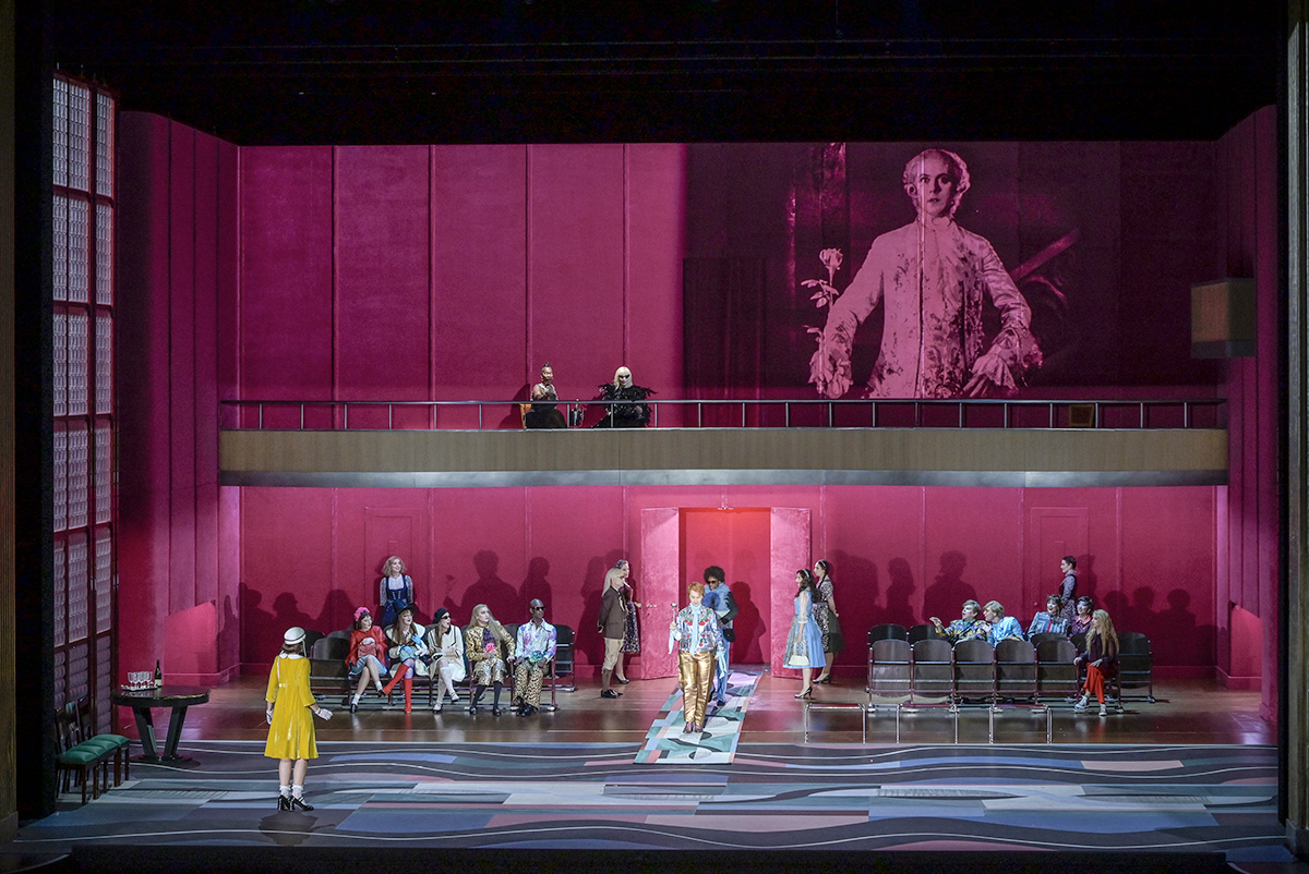 Warlikowski sets the evening in a single set, by his long-term collaborator Małgorzata Szczęśniak, which is accessorized at times by items of furniture and walls with frosted glass. In his reading, the Marschallin is an actress, Octavian a filmmaker, both enjoying a torrid love affair at the start of the evening. The prelude is accompanied with a film of Gens and a very feminine O’Sullivan enjoying, what I presume to be, quality naked time. This brought home how the Marschallin might have seen the affair with Octavian as a way of regaining her youth. Similarly, Warlikowski has Gens sing her Act 1 monologue into a camera at the front of the stage, reminding us that for celebrities, nothing is truly private – even those most intimate and vulnerable moments. He populates the stage with a variety of extras in Act 1, adding potential layer upon layer on the narrative, making us question what might be real and what might be imagined. The costumes, also by Szczęśniak, are bright and vibrant, the presence of the servant, here a twerking, Grace Jones lookalike, passing knowing glances to the Marschallin as she breakfasts with Octavian, making clear that Octavian was one of the Marschallin’s many lovers. Similarly, the Marschallin is dressed up in quite a ridiculous hat, while the Italian singer sings to her, which prompts her comment of ‘Mein lieber Hippolyte, heut haben Sie ein altes Weib aus mir gemacht!’. Yet what these multiple layers and visual interest succeed in doing is, rather than occluding the narrative, Warlikowski makes it even more potent. So that when the Marschallin is finally alone at the end of Act 1, the effect is so emotional, it becomes heartbreaking. Particularly so since the closing pages of Act 1 see Gens’ Marschallin walk off, while a younger girl takes her place sitting at the dressing room mirror. In so doing, Warlikowski not only gives us a mediation on the passing of time, he also reminds us that in film, indeed also in opera, there will always be a younger person to take over. That could sound quite cynical in a way, but that was certainly not the effect. Rather, there was a sense of acceptance of the passage of time, of knowing when to let go of a love that, however much one might want it to, just can’t last forever, and that in walking away through the doors at the back of the set, the Marschallin gave her lover the chance to live the life he was meant to live.