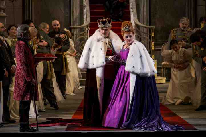 Jacopo Spirei’s staging seems to set the work around the time of composition. The palatial set is certainly grand to look at, with the big festive scenes populated with the large chorus inspired to strike poses of general merriment, including sideways swaying to add that festive air. It’s certainly an expansive show to look at, although I must admit to some sympathy for Clémentine Margaine’s Gertrude who, for much of the evening, had to occupy the stage with the most unfortunate ginger beehive wig – costumes by Giada Masi. Hamlet’s grasp of sanity was tenuous from the start, with John Osborn jumping around the stage in an uncontrolled fashion during his first confrontation with Claudius and Gertude.
