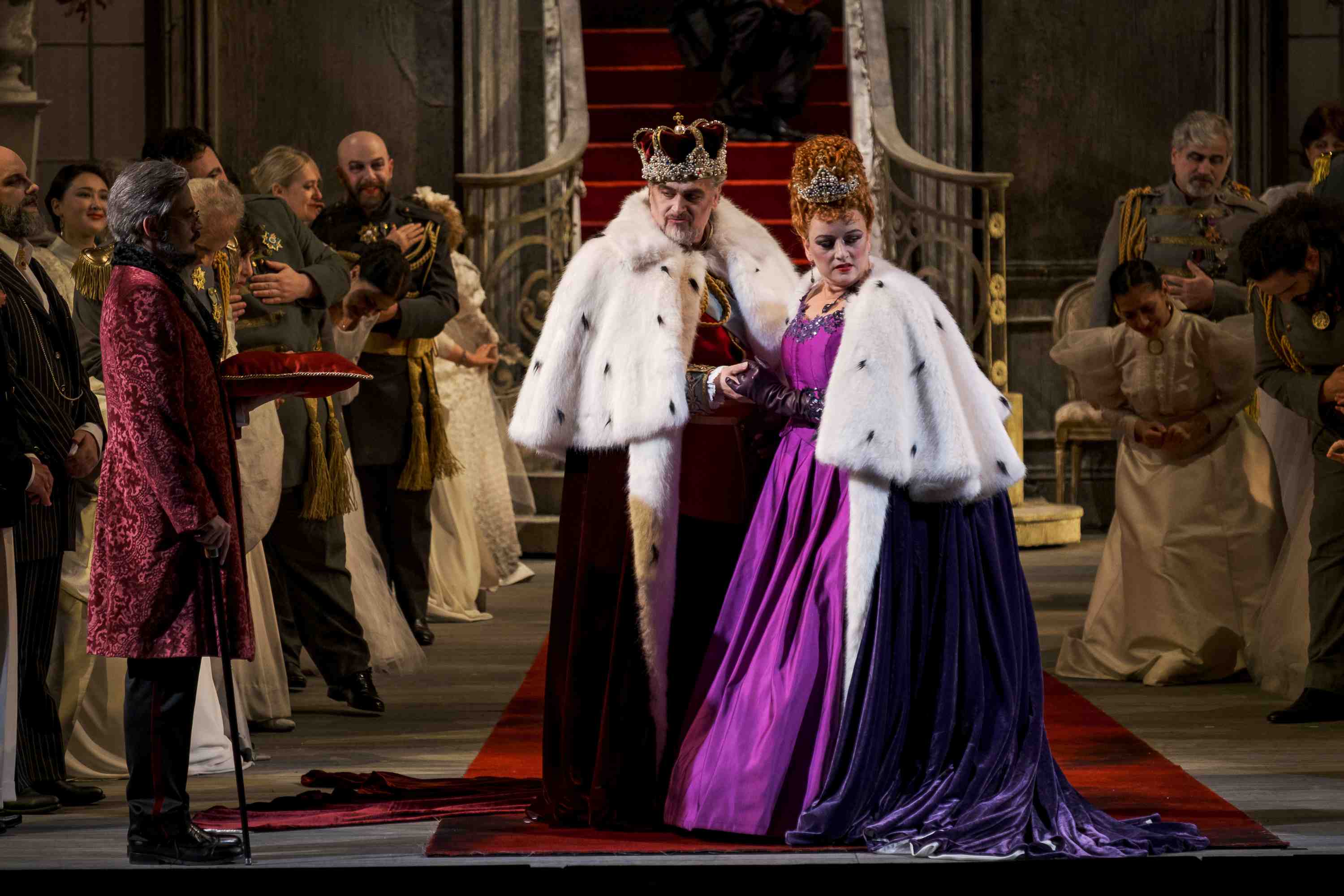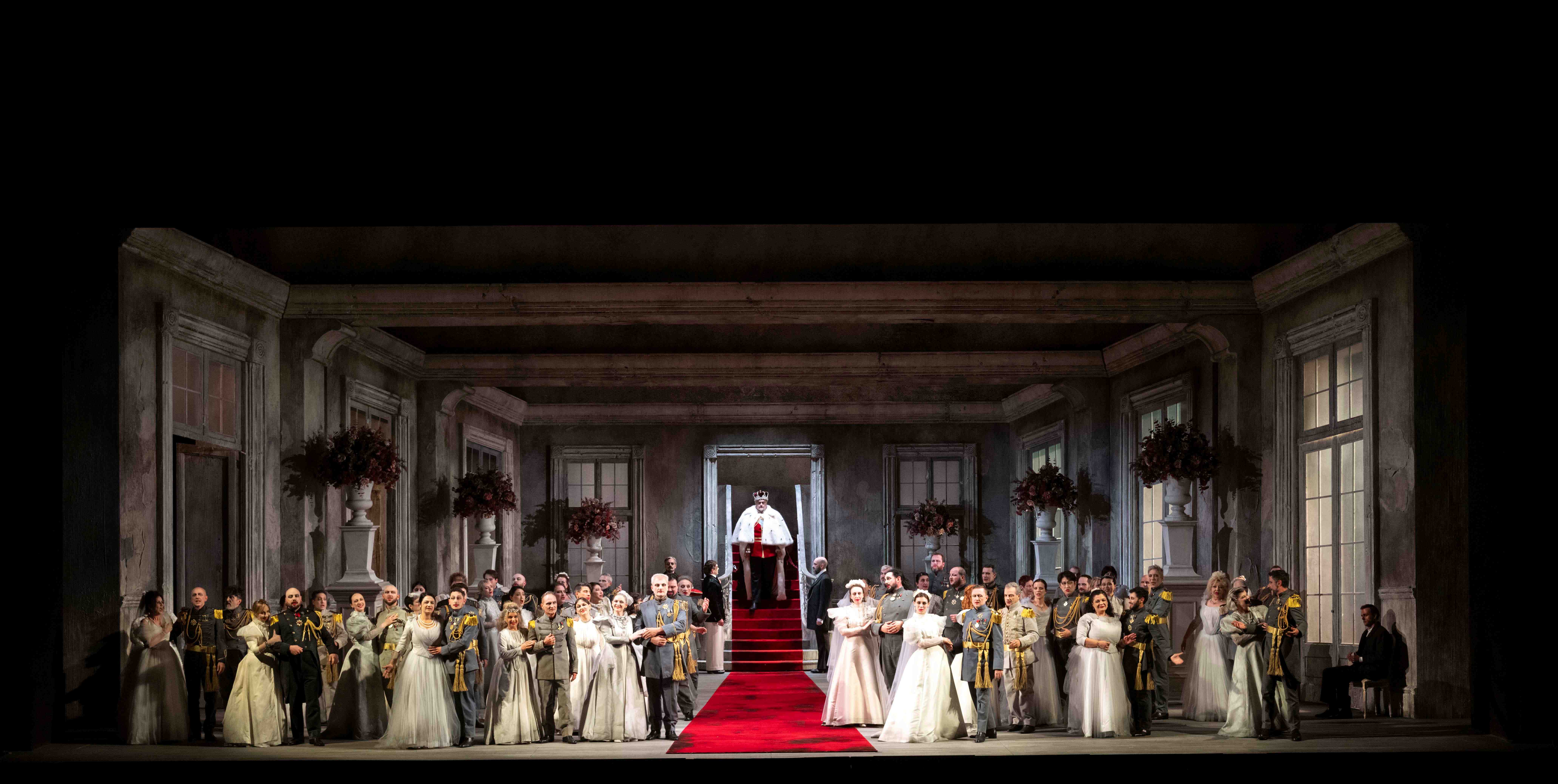 Jacopo Spirei’s staging seems to set the work around the time of composition. The palatial set is certainly grand to look at, with the big festive scenes populated with the large chorus inspired to strike poses of general merriment, including sideways swaying to add that festive air. It’s certainly an expansive show to look at, although I must admit to some sympathy for Clémentine Margaine’s Gertrude who, for much of the evening, had to occupy the stage with the most unfortunate ginger beehive wig – costumes by Giada Masi. Hamlet’s grasp of sanity was tenuous from the start, with John Osborn jumping around the stage in an uncontrolled fashion during his first confrontation with Claudius and Gertude.