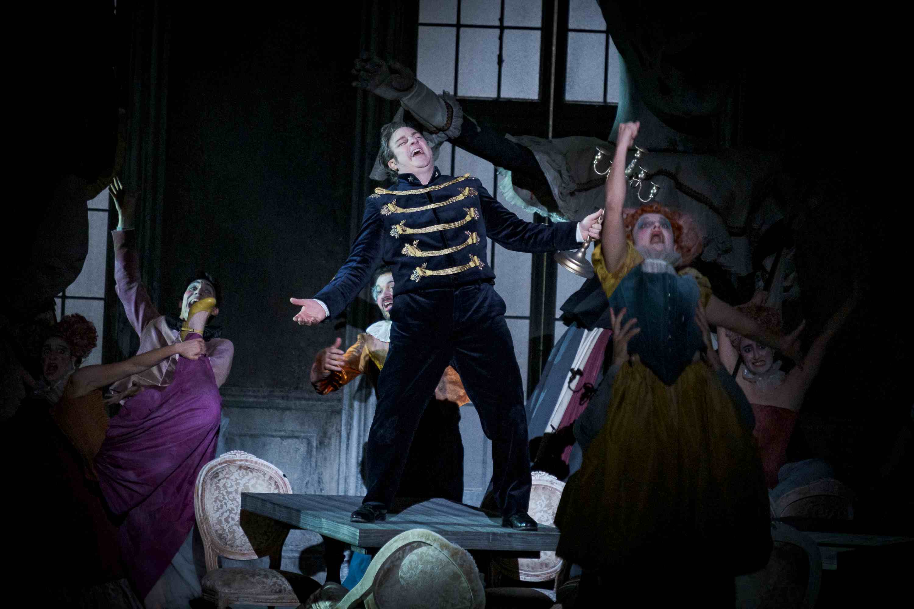 Julien Henric brought an easy top to his singing of Laërte, the high-lying lines holding no terrors for him. Alexander Marev sang Marcellus in a narrow, robust tenor, while Tomislav Lavoie sang Horatio in a firm, healthy baritone. The passage of the years might be audible in Alastair Miles’ bass, the tone not quite as generous of yore, but his stage presence and verbal acuity are undimmed. We also had a very impressive duo of gravediggers from the Regio’s ensemble in Janusz Nosek and Maciej Kwaśnikowski, two healthy and youthful voices with impressive sheen.
