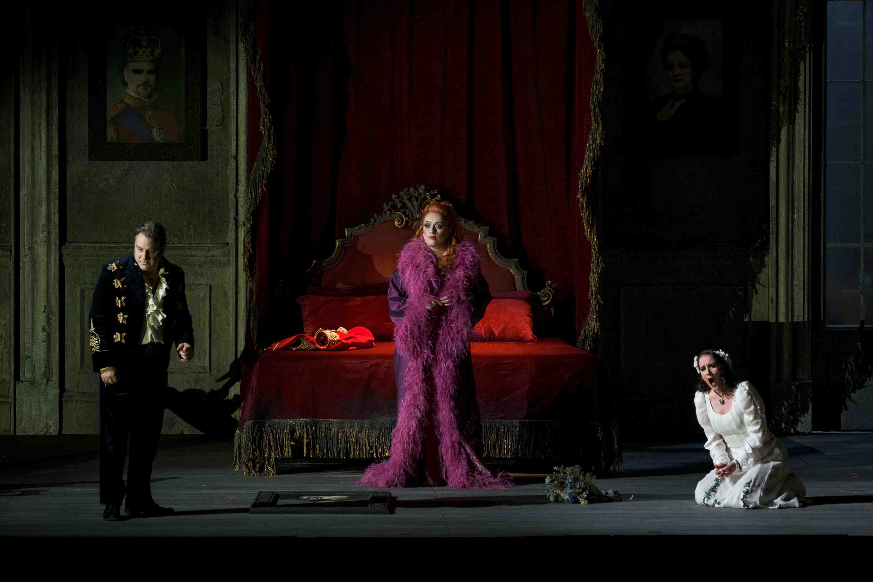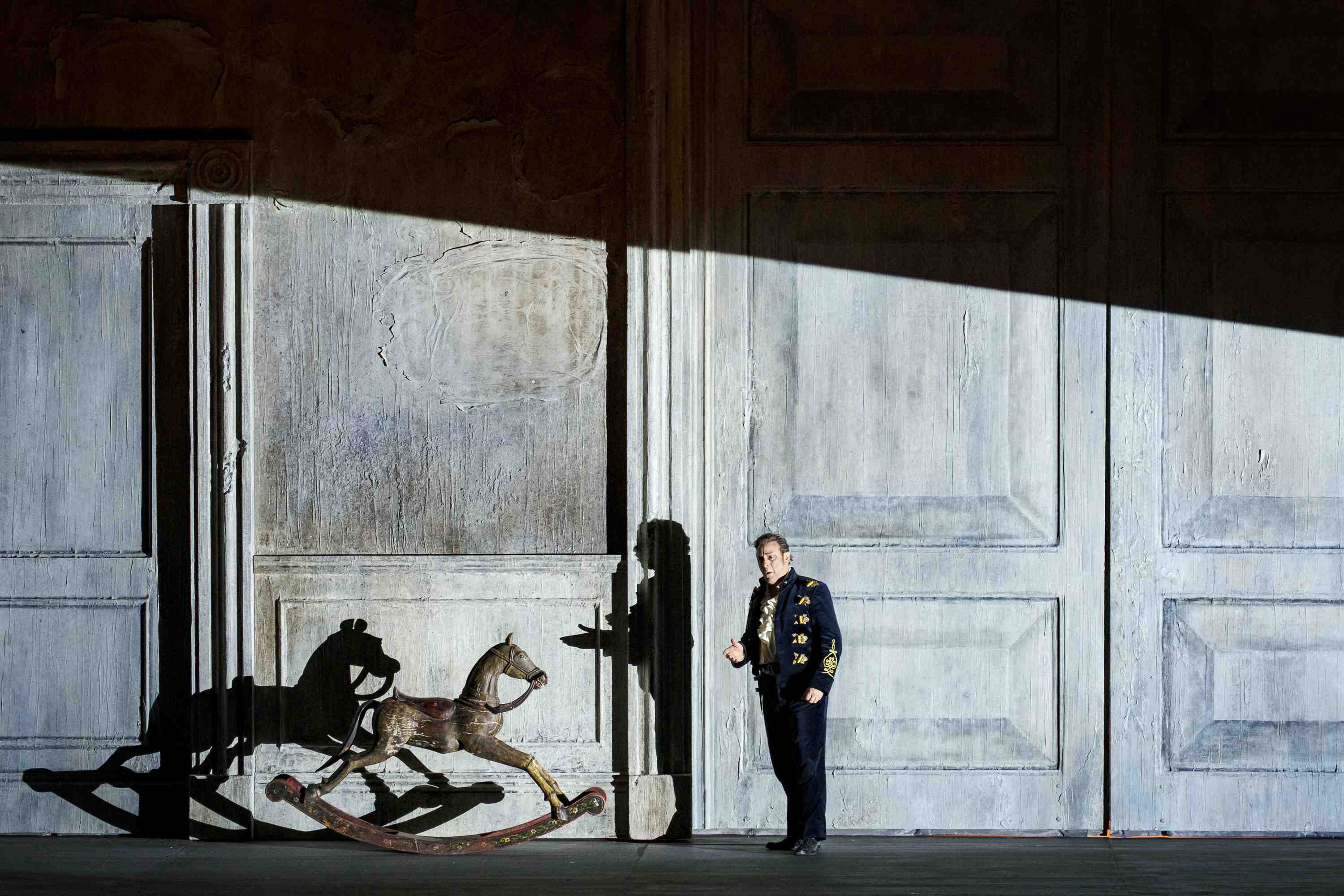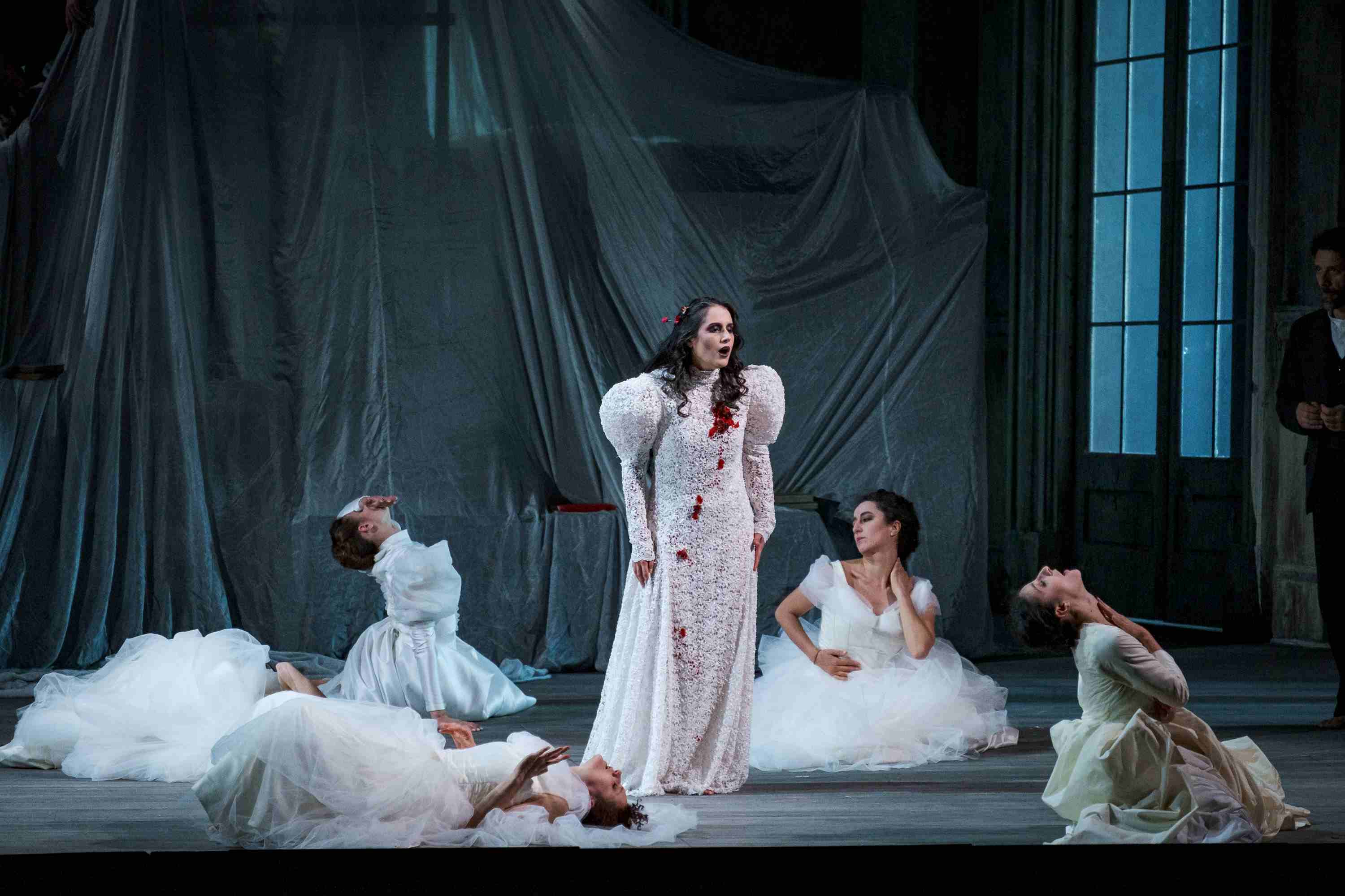 Margaine swept all before her as a commanding Gertrude. The voice has thrilling amplitude, filling the house with waves of sound. Margaine’s mezzo is utterly healthy, able to cross the registers without a hint of a break, always absolutely even from top to bottom. Naturally, it goes without saying that so much was sung off the text, the words always clear and filled with meaning. She was magnificent. It sounded to my ears that Riccardo Zanellato’s Polonius took a while to find his best form, the voice initially rather grainy, though lugubrious. Later, he found a Verdian depth to his scene with Nicolò Donini’s confident Polonius, offering a tortured reading of the guilty king.