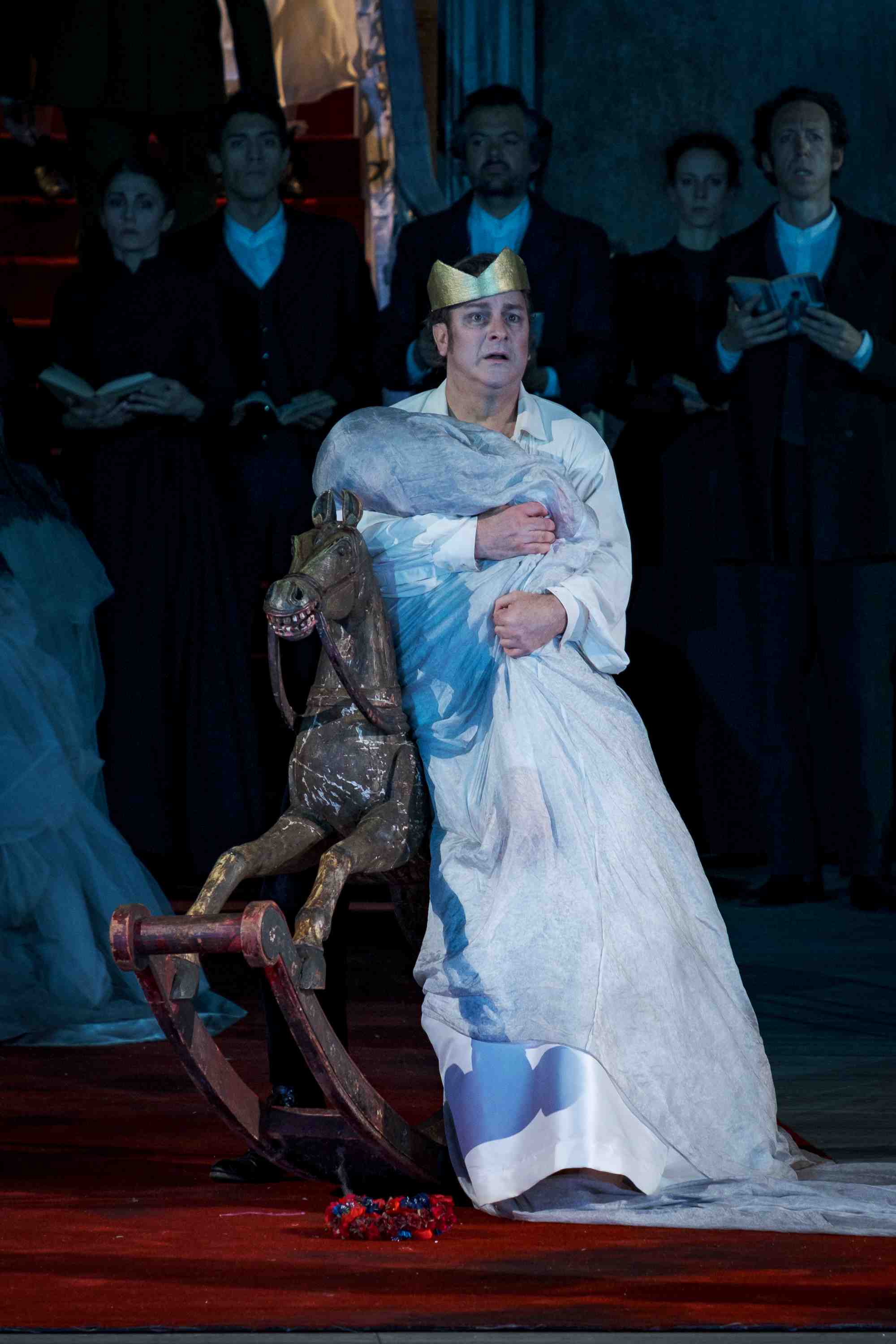 Spirei clearly makes a connection between Hamlet’s childhood and the action taking place. When the ghost appears, he does so as a suited figure who sings from fields of wheat at sunset, or tends to a young child in the same outfit as Hamlet. Yet what the nature of that connection is, and why Spirei felt it necessary to include it, is one I’m not convinced he fully explores. Yes, Hamlet sings his final scene on the wooden horse his father gave him in one of his ghostly apparitions, but the why is something that isn’t fully explored. Moreover, Spirei has a group of a dozen extras, listed in the program book as ‘performers’, who are constantly present on-stage reading books, or walking around with the books on their heads. At first, I did wonder if Spirei was using them to represent the characters in Shakespeare’s play who don’t appear in the opera, but instead their presence felt distracting for the most part. That said, during the scène de la folie, the ‘performers’ did add an interesting visual touch. The women were dressed in white dresses, as was Ophélie, while they waved books around to imitate birds in flight. Later in the scene they wrapped Ophélie in a white shroud in which she perambulated the stage – it was undoubtedly a haunting image. For the most part Spirei’s staging looks good and managed to tell the story with relative clarity. And while there were some moments of visual clutter that distracted rather than enhanced the narrative, on the whole it was an effective enough piece of theatrical storytelling.