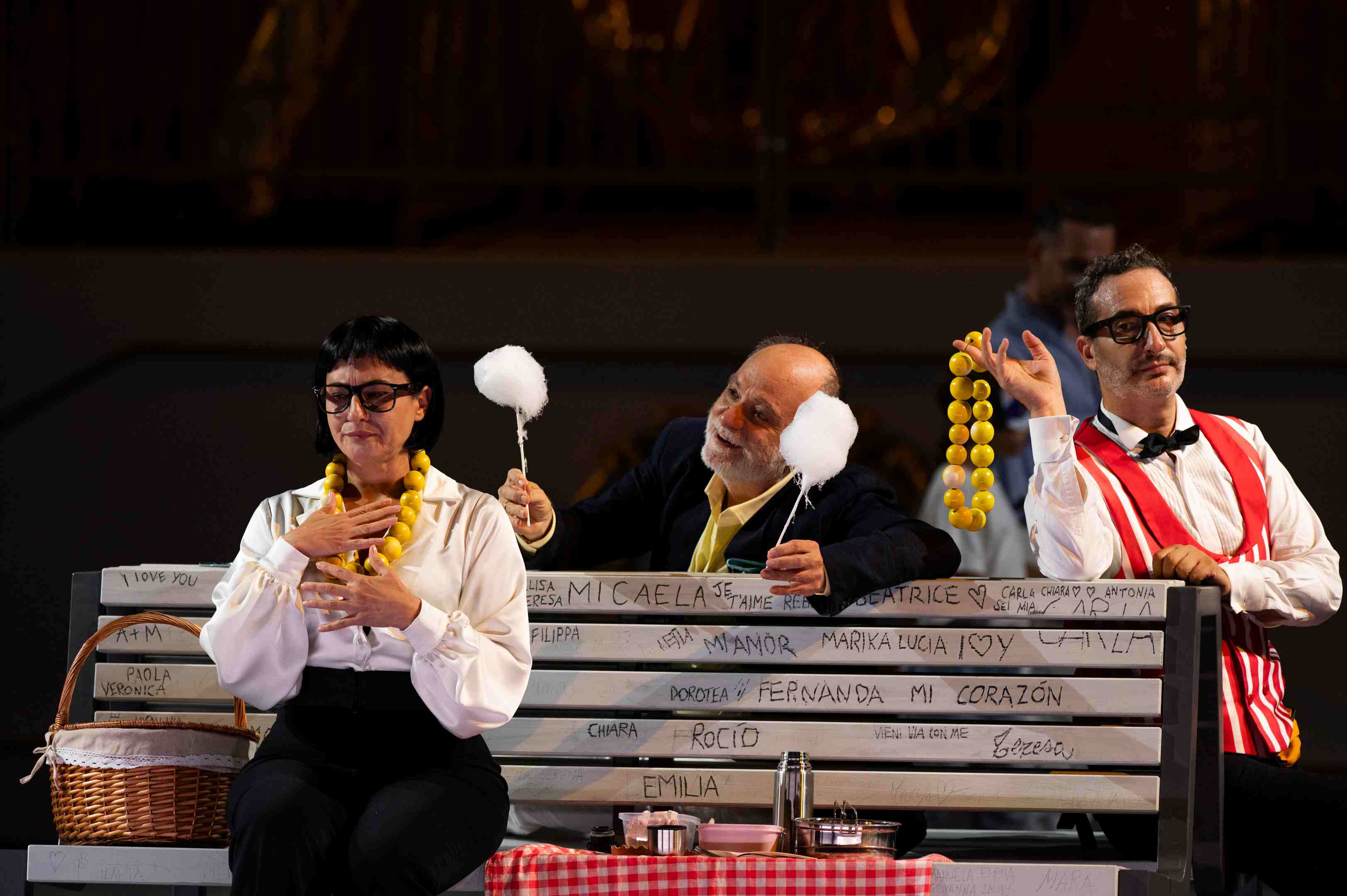 Barkhatov’s staging is an intelligent and thoughtful one.  He recognizes that this is a much more complex work that might initially seem the case – it has comedy but it also has tragedy.  The Teatro dell’Opera chose to cast an older Don Giovanni than one often sees.  I hope Roberto Frontali will forgive this rather ungentlemanly comment, and tonight he was making his debut in the title role.  Casting an older singer is a perfectly logical choice, given how many sexual conquests Don Giovanni has experienced.  Yet, in doing so, Barkhatov and Frontali draw out the power relationships inherent in the work.  Setting the work, as Barkhatov does, in a fairground that appears to be owned by Don Giovanni, with an impressive set by Zinovy Margolin dominated by a real fairground wheel, brings out the fact that Giovanni uses his money, status and power to exploit others.  I don’t think I’ve ever seen a production where the exploitation of Zerlina and Masetto was so vividly brought to life – not to mention the impressive fairground train that carried Zerlina, Masetto, and the chorus across the stage.