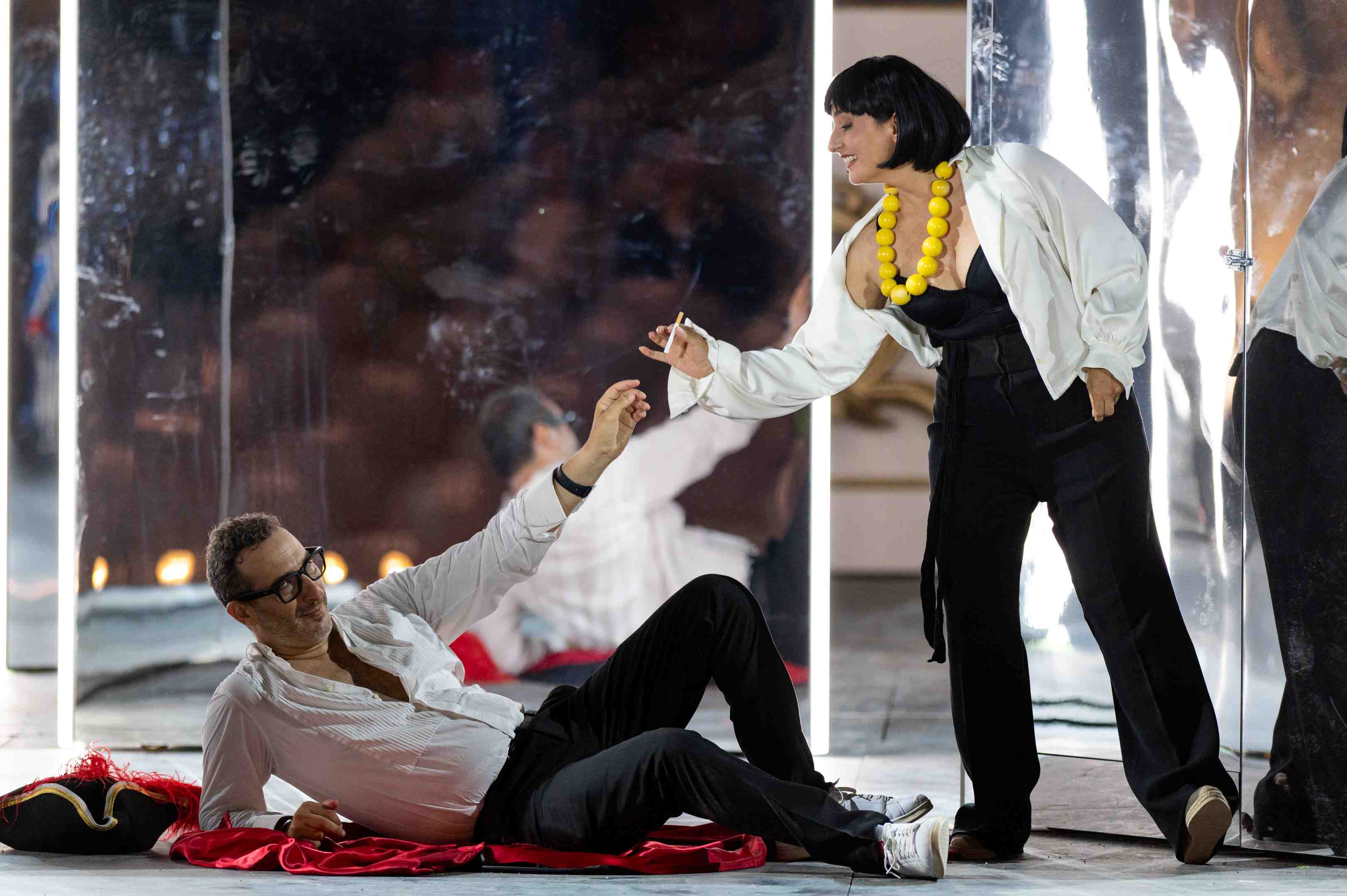 For this year’s Caracalla Festival, the Teatro dell’Opera di Roma is also presenting performances in the imposing Basilica di Massenzio, located in the heart of the Roman Forum, right next to the Colosseum.  It’s a striking building, constructed between 308 and 312 CE. The huge central portion of the building is well suited for an operatic stage, offering a large arch with an enclosed circular space which formed the setting for Vasily Barkhatov’s staging of Don Giovanni to take place in.  As is customary for the festival, the evening was amplified.  While it gave us the opportunity to hear a performance in such an impressive place, it was also problematic since the orchestral sound was recessed, sounding as if it were in a completely different acoustic, and the positions of the voices in the amplification did not reflect the placement of the characters on stage, giving the impression of watching a performance taking place further away from us than was actually the case.