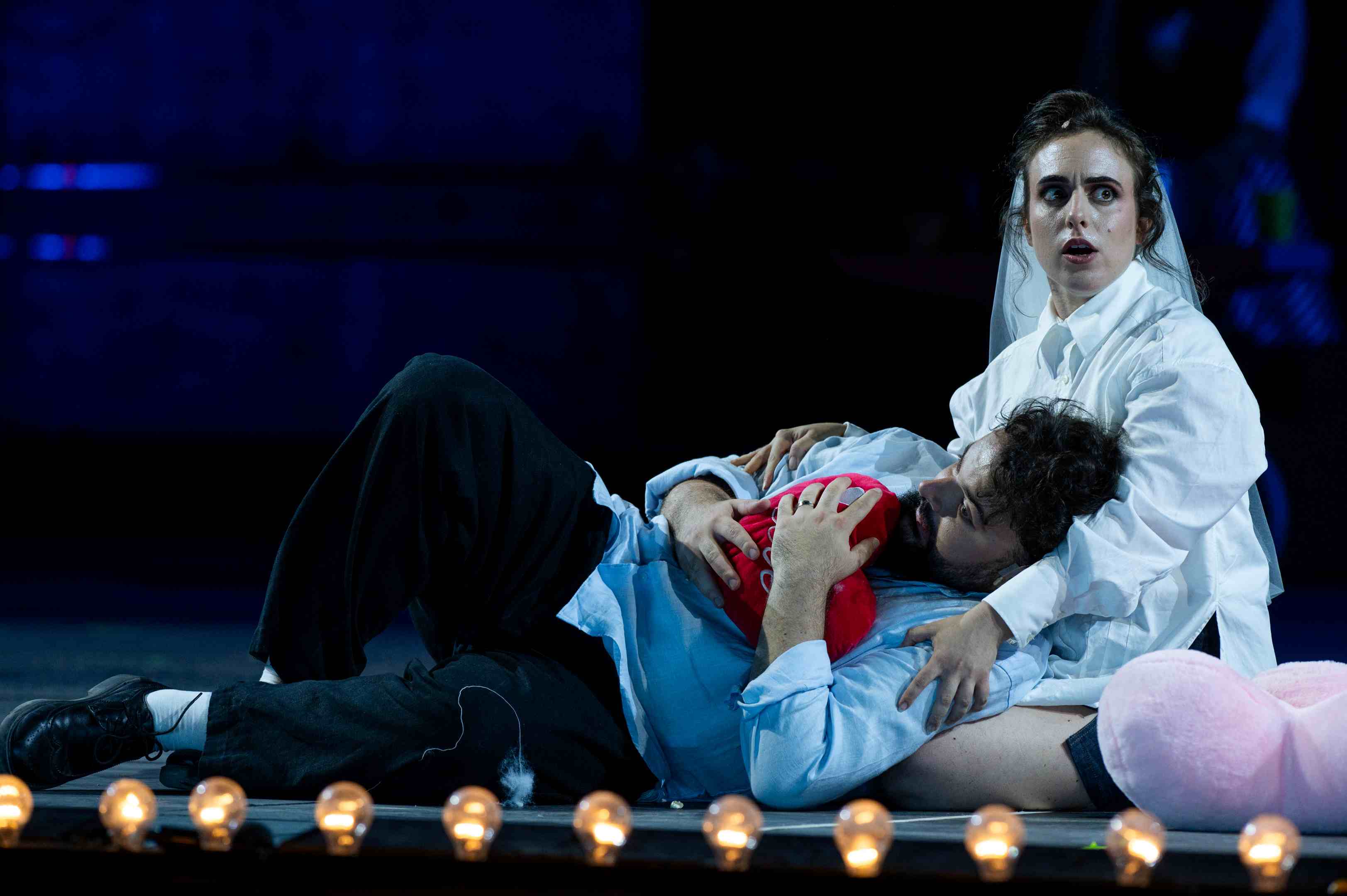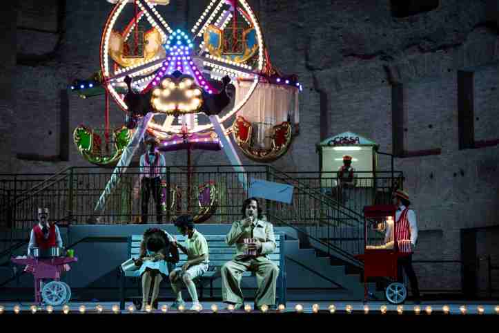 I found that Barkahtov really succeeded in bringing out that fantasy of the work, through this fairground setting.  The comedy was also there, for instance in the Act 1 finale, with the principals sitting in separate gondolas on the wheel, going around in circles, yet none of them able to escape from their individual obsessions.  There’s a depth below the surface in Barkhatov’s staging that I found to be immensely compelling.  Not everything he does works, however, and I did leave with an impression that the staging fizzles out towards the end.  Elvira appears to consensually conjugate with Leporello at the start of Act 2, which means the subsequent sextet makes no sense.  Although here again, Barkhatov could be making a point about power relations, with Elvira wanting to deny eloping with a servant.  Similarly, the stone guest scene fails to convince, with the Commendatore, a constant presence on stage throughout the evening, simply taking Giovanni to a gondola on the wheel.  I also can’t quite work out why Anna perambulated the stage with an urn throughout the evening, only to scatter the ashes during ‘non mi dir’.  The biggest frustration is that Barkhatov cuts the epilogue.  The epilogue is absolutely essential both musically and dramatically, rounding off the characters’ journeys, whereas here they simply fade out of focus.  It did feel that Barkhatov’s staging is an extremely strong one, one based in an intelligent reading of the libretto, yet I cannot escape the sense that it did also feel like a work in progress.  I very much hope that the Teatro dell’Opera will bring the staging to the Teatro Costanzi and invite Barkhatov back to revise it, since I very much feel that this is a Don Giovanni that has a lot to offer.