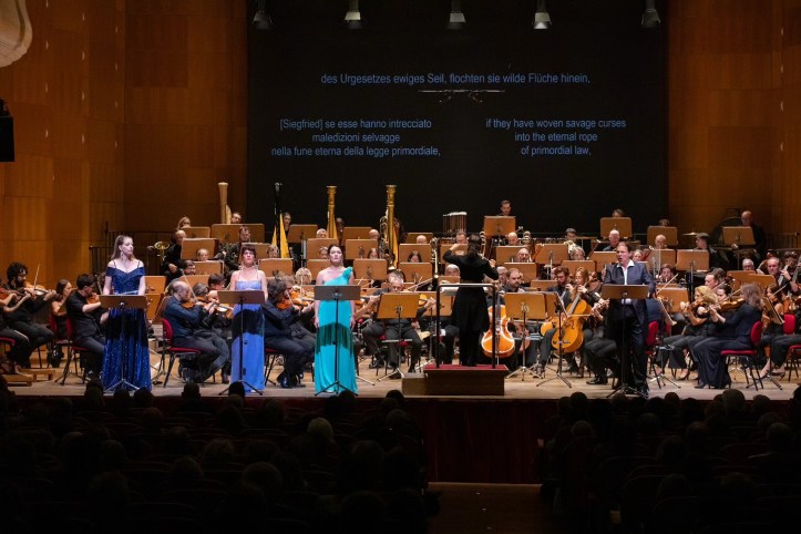 As was the case with the other instalments in the cycle, the performance was given in concert, with the surtitles showing the original German text, with Italian and English translations, and the stage instructions projected in Italian to give setting and context. The cast generally sang from music stands at the front of the stage, with the exception of Albert Pesendorfer’s Hagen who sang without a score, and entrances and exits had been carefully coordinated. The tenors and basses of the chorus sang from the gallery at the right, with the sopranos and mezzos brought in to sing from the platea for their brief contribution. What it did allow us to do was to simply bask in the glow of the playing of the Comunale orchestra and its chorus. The acoustic of the Teatro Manzoni is warm and immediate, with a rich bass, giving ample space for Wagner’s writing to bloom within.
