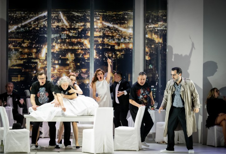 Frau is difficult work to stage, due to the symbolism of the libretto including the suggestion of unborn children’s voices emerging from a pan, or a singing falcon. And yet, Strauss’s music offers us so much in terms of impact, able to pull out so many emotions, even if one might feel the heteronormativity of the libretto to be rather dated. When I go to the opera, I want to see an evening that amplifies the music and that pushes us to feel all the emotions contained within. All this is a preamble to write that Konwitschny’s staging is nothing short of a travesty and complete catastrophe. It vandalizes the work without, in return, giving us any insight or emotional impact. He sets the work as if a gangster film, with the Kaiser as the gangster leader and the Kaiserin a drug-addled streetwalker who he violently abuses in Act 2. The singers are exceptionally brave, even if they precipitated a mass exodus for the exits at intermission. Barak appears to be a gynaecologist, while the Färberin and the brothers work in his surgery. The Amme is a constant presence, to what end it’s hard to tell. Within this framework, Konwitschny seems to be failing at the very simple act of stagecraft – telling a story. What we see has no resemblance to the sung text. That isn’t necessarily a downside if the stage pictures amplify the music. Instead, they actively work against it, giving us an evening completely robbed of emotion. Furthermore, it’s hard to understand who these characters are, and why we should care about them. Particularly since the Kaiser doesn’t show any sign of petrifying, but shows up in Act 2 to rape the Färberin. While in Act 3, Barak sings his ‘mir anvertraut’ directly to the Färberin’s face. Worse, Konwitschny’s treatment of women robs them of agency, removing the compassion that the Kaiserin standing up to Keikobad represents.