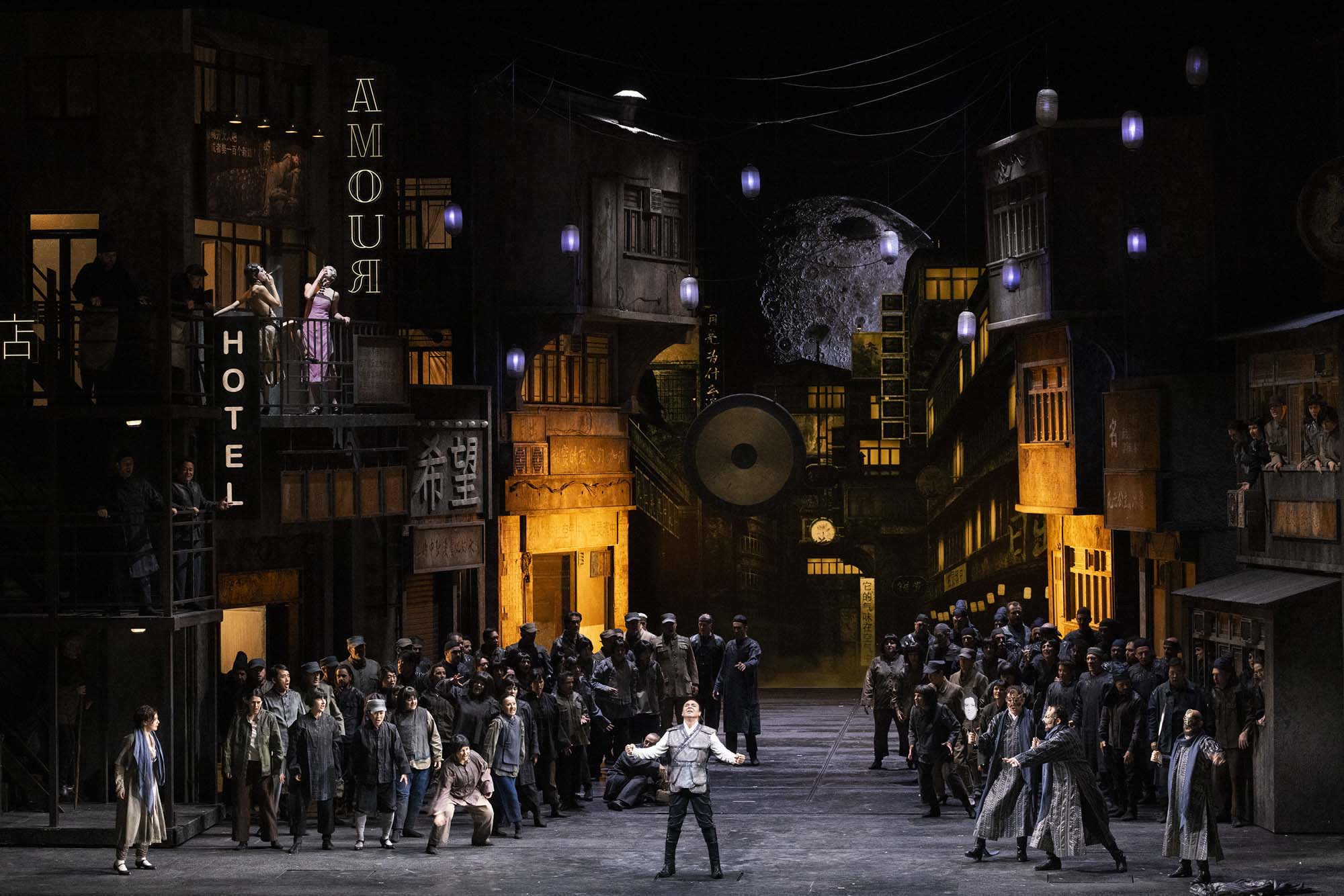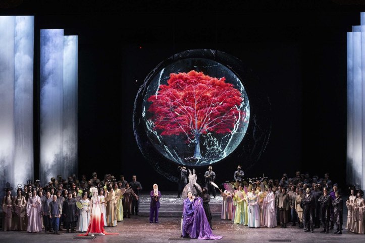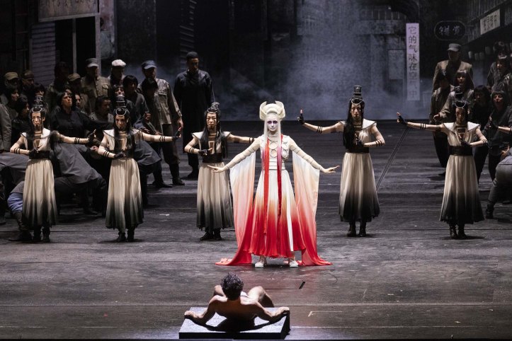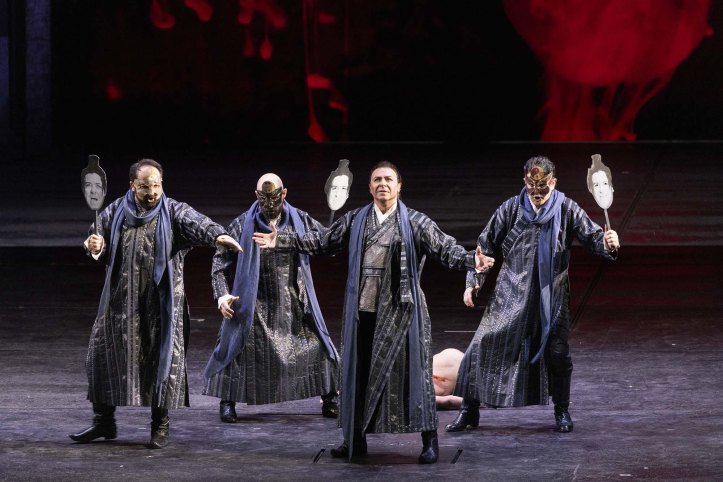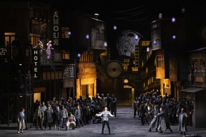 For example, Turandot appears to be incarnated by two people – a danseuse who flails around during Turandot’s interjections, and the singer herself. In the closing duet, Calaf initially addresses the double, but as the duet proceeds, the double seems to evaporate and is ultimately gone. Perhaps, this is Livermore’s way of showing that Turandot prevented herself from feeling love by invoking Principessa Louling and surrounding herself with brutality. It’s certainly a plausible way of illustrating Turandot’s journey, even more so when the duet is staged with the utmost simplicity of a bare set and only the moon shape for decoration, in contrast to the preceding crowded stage. Similarly, in Act 1, the impressive set, by Livermore, Eleonora Peronetti and Paolo Gep Cucco, has the presence of a thin, ghostly female figure standing on the balcony of an establishment called ‘Hôtel Amour’. What this figure represents and what her role is, is unclear. Is Livermore making her the madam of a brothel? Or is he suggesting that love is a temporary state, one that one stays at and then leaves. There’s also an equine figure, that trotters on noisily at the end of each act, whose presence also seems superfluous and unclear. Moreover, some of the choreography, uncredited, is unintentionally comic in Act 1; rather than incarnating a threatening mob, the effect instead was risible. That said, having Ping, Pong and Pang together with their attendants end the opening scene of Act 2 with a conga line was certainly arresting. I also appreciated how Livermore had Pong surrounded by some buff, shirtless men in that opening scene of Act 2, while Pang was surrounded by nubile ladies. Perhaps the most striking moment in Livermore’s staging comes after Liù’s demise, the moment when Puccini ceased writing. Tonight, Luisotti didn’t close the evening at that moment as Toscanini did in 1926. Instead, the moon was filled with a projection of Puccini’s face as the chorus and other principals filed off, before the closing duet began. Livermore’s staging definitely gives us a visual feast, but interrogating it on a deeper level, reveals it to not completely add up.