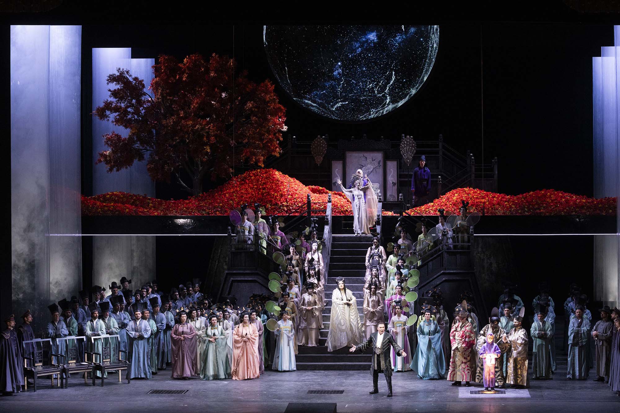Livermore most definitely gives us a ‘show’ in his production, tonight revived by Laura Galmarini. As indeed does the actor playing the Principino di Persia who is stripped naked by Turandot’s people, showing the wounds on his back from torture, just before he’s murdered in front of the crowd. Livermore lays bare the brutality of the society, the violence intimated by use of a corps of danseurs and danseuses who move around the stage threateningly. He makes a genuine attempt to grapple with the problematic issues in the libretto – the man who won’t take ‘no’ for an answer, the woman taken against her will – engaging with them in a way that a spectacle such as Zeffirelli’s, for instance, doesn’t. Livermore’s staging looks spectacular, the stage full of people, with the mighty Scala chorus at full strength, along with the extras. Moreover, he makes use of video, by D-WOK, to set his staging in a phantasmagorical world, one where the moon, upon which images are projected, seems to incarnate multiple realities. The visuals are undoubtedly arresting, if one stays on the surface, but the moment one starts to question what one sees, I’m not convinced it adds up fully to the sum of its parts.